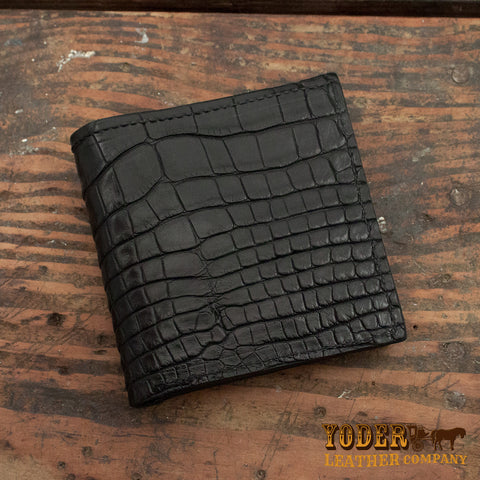 This black hipster wallet is handcrafted from the highest quality American Alligator skin available. The inner lining is a layer of supple top grade lining leather. The top grade interior has 12 credit card slots and a large money pocket with a separator down the middle creating two pockets for cash. You can also hold more credit cards or similar sized items in the three slots behind the credit cards.