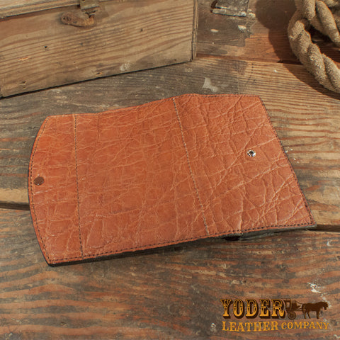 This clutch is made with beautiful caramel brown elephant hide. It is stitched with heavy duty nylon thread that accents the color of the leather. It has 6 credit card slots. There is also space behind the credit card slots to store paper cash. The other side is a coin pocket with snap that also has a pocket behind it.