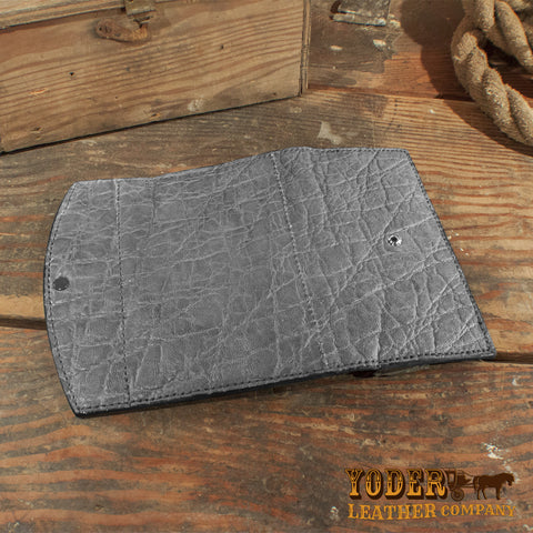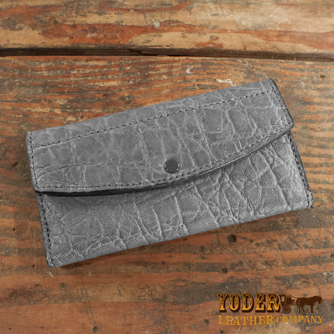 This clutch is made with beautiful gray Elephant hide. It is stitched with heavy duty nylon thread that accents the color of the leather. It has 6 credit card slots. There is also space behind the credit card slots to store paper cash. The other side is a coin pocket with snap that also has a pocket behind it.