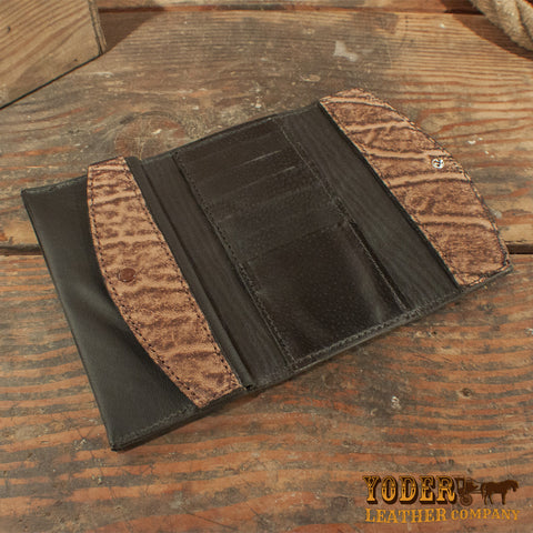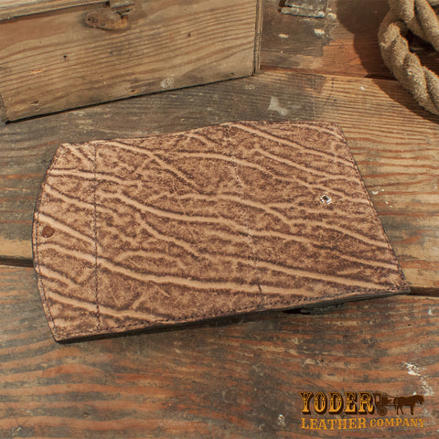 This clutch is made with beautiful rustic brown pattern elephant hide. It is stitched with heavy duty nylon thread that accents the color of the leather. It has 6 credit card slots. There is also space behind the credit card slots to store paper cash. The other side is a coin pocket with snap that also has a pocket behind it.