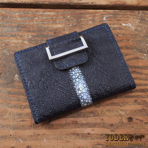 This wallet is made with beautiful authentic string ray skin that is dyed dark blue. It is stitched with heavy duty nylon thread that matches the color of the leather.
