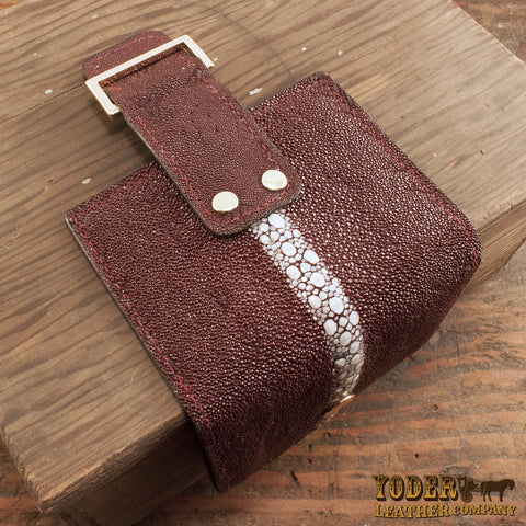 This wallet is made with beautiful authentic string ray skin that is dyed a dark red. It is stitched with heavy duty nylon thread that matches the color of the leather.