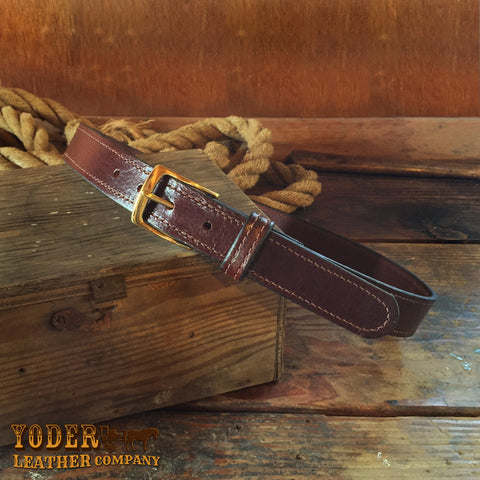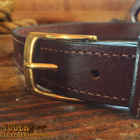 This belt is 1.25" Wide to fit nearly all dress pant belt loops. It is premium African Water Buffalo leather. Comes with 7 large oval holes spaced 1 inch apart. It comes with a beautiful rounded solid brass buckle. Water Buffalo is a very strong but pliable leather. This belt is stitched to add a nice finish to this solid strap of leather. This is one piece of leather and won't separate like bonded and glued Chinese imports.